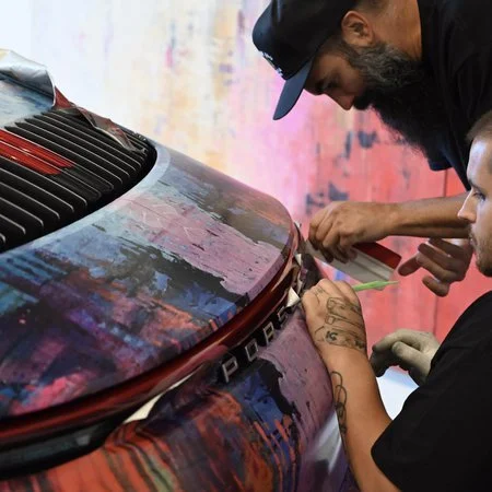 I actually started the project about a year ago. I learned that what initially appeared to be quite a simple process was in fact, not. I first chose a 6-foot by 6-foot painting and blew it up to the size I needed to cover the entire car which was about 10-feet by 20-feet. However, when the print came back it was obvious that it had been enlarged. I wanted the wrap to be life-like in terms of scale and detail. That way you could actually see the texture of the canvas on the car. So, I set about painting one giant canvas that was 20-feet wide and was logistically hard to do. The other challenging part was to have the drips of the canvas wrap around the corners of the painting, too (much like folding a sheet around a bed there are corner pockets to contend with). I also learned that a Porsche 911 is probably the hardest car to wrap because of all its curves. I decided to make the project even trickier by using reflective vinyl which is harder to wrap but it looks wild at night. Each panel was printed separately and then applied individually so each panel had to line up perfectly and drip either side of the gap. Fortunately the guys wrapping it enjoyed a challenge, too.