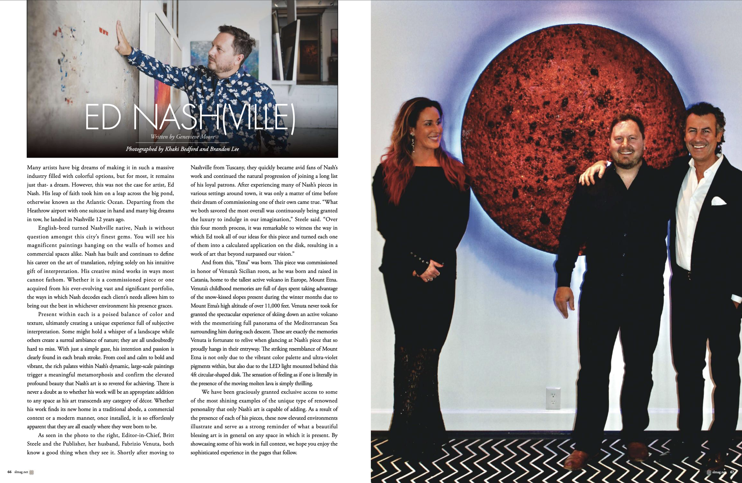 As seen in the photo to the right, Editor-in-Chief, Britt Steele and the Publisher, her husband, Fabrizio Venuta, both know a good thing when they see it. Shortly after moving to Nashville from Tuscany, they quickly became avid fans of Nash's work and continued the natural progression of joining a long list of his loyal patrons. After experiencing many of Nash's pieces in various settings around town, it was only a matter of time before their dream of commissioning one of their own came true. "What we both savored the most overall was continuously being granted the luxury to indulge in our imagination," Steele said. "Over this four month process, it was remarkable to witness the way in which Ed took all of our ideas for this piece and turned each one of them into a calculated application on the disk, resulting in a work of art that beyond surpassed our vision."