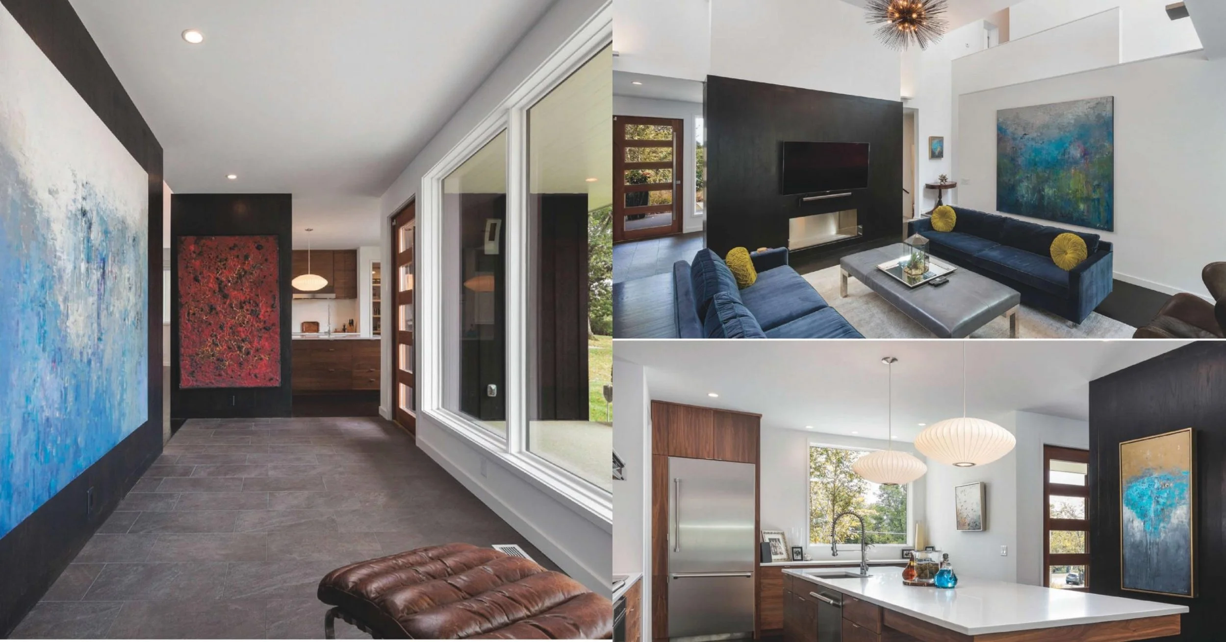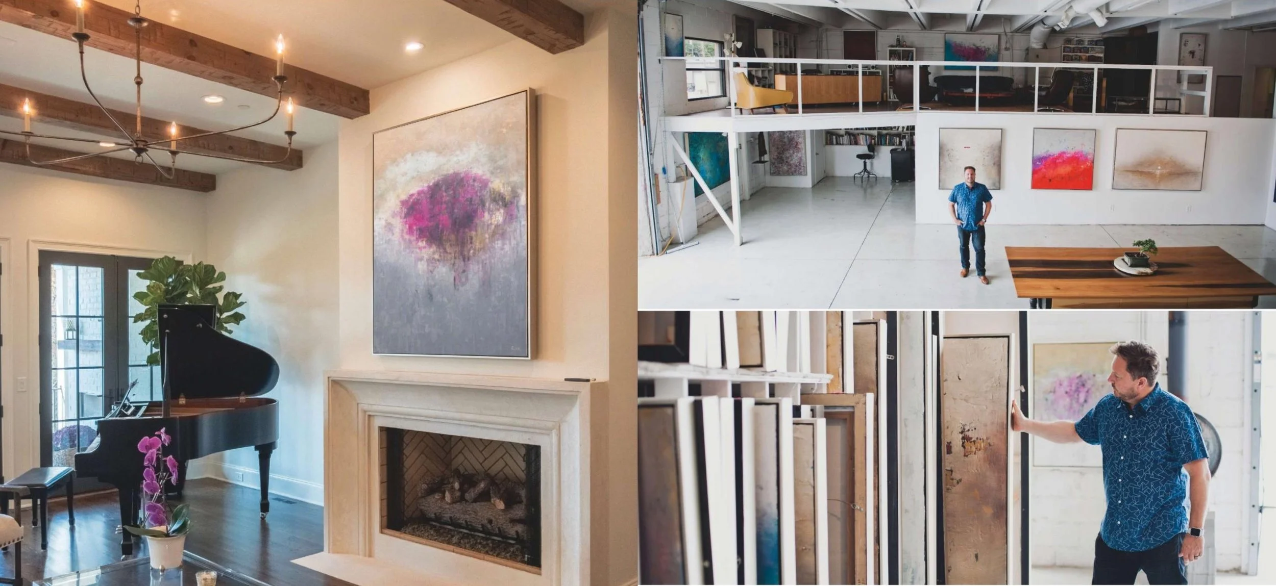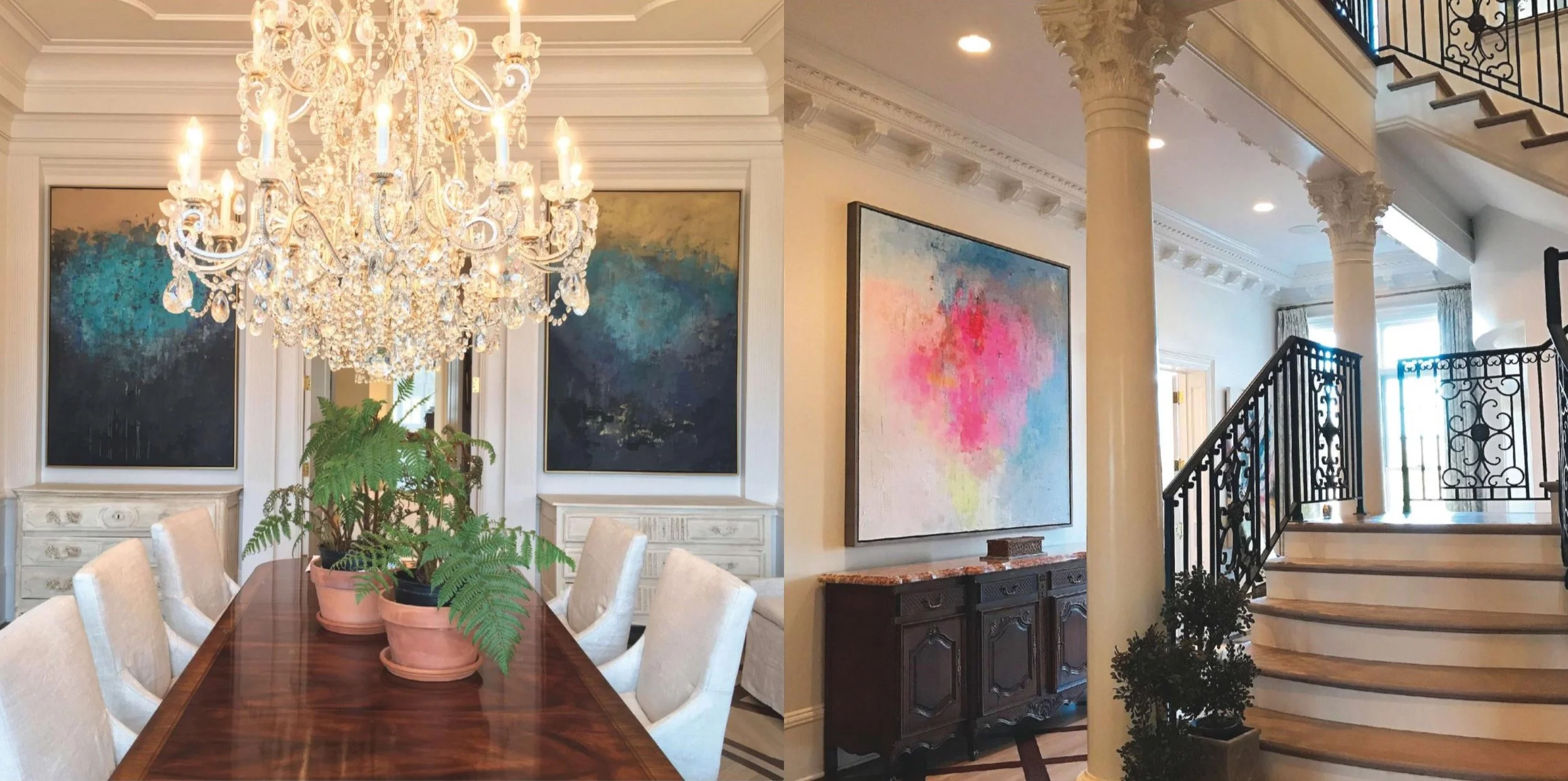 As seen in this home, it is immediately apparent why the homeowner chose these paintings as they each bring such life to both spaces. The rooms, very strategic in their design, showcase his work in a way that is muted but recognized. "My home has quite a lot of intricate millwork that lends to a formal feel and I wanted an outstanding large piece of art in an abstract style to offset the formality," notes the homeowner, Pamela Bollinger.